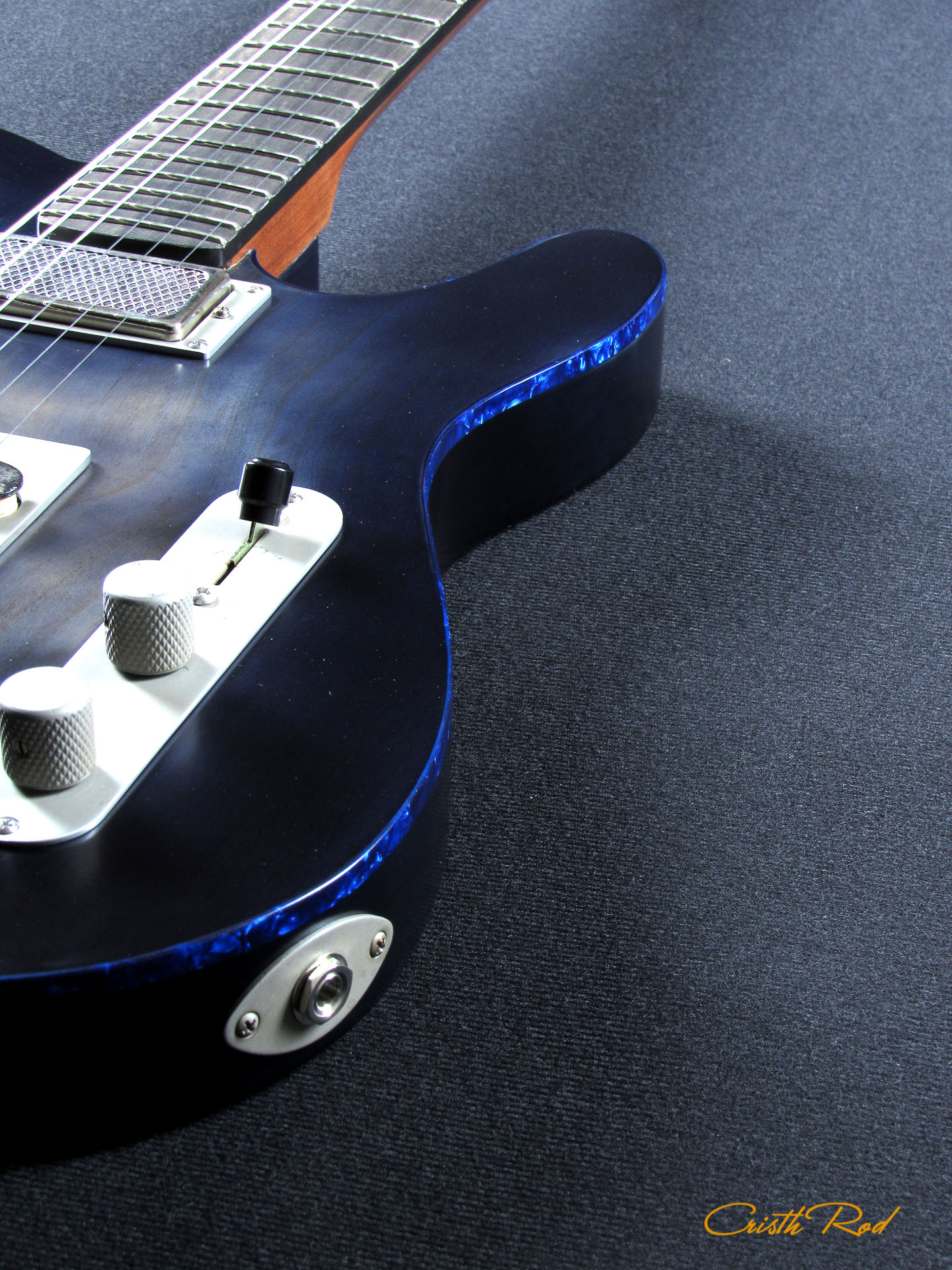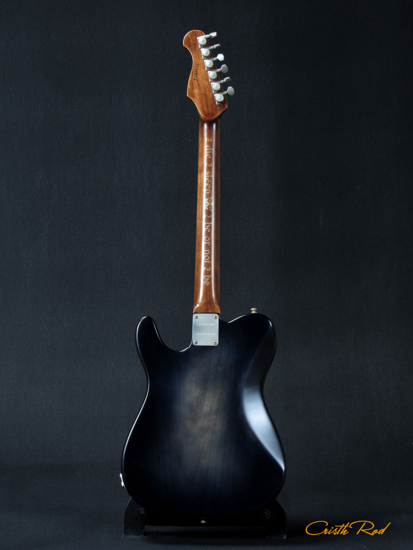 Estuche rígido | Enganches de seguridad | Componentes Mate Relic | Pala tallada con caracola | Mástil personalizado con texto y hojas de arce | Binding del cuerpo en sintético nácar azul