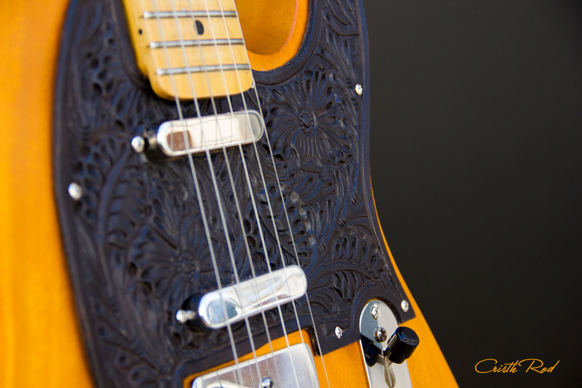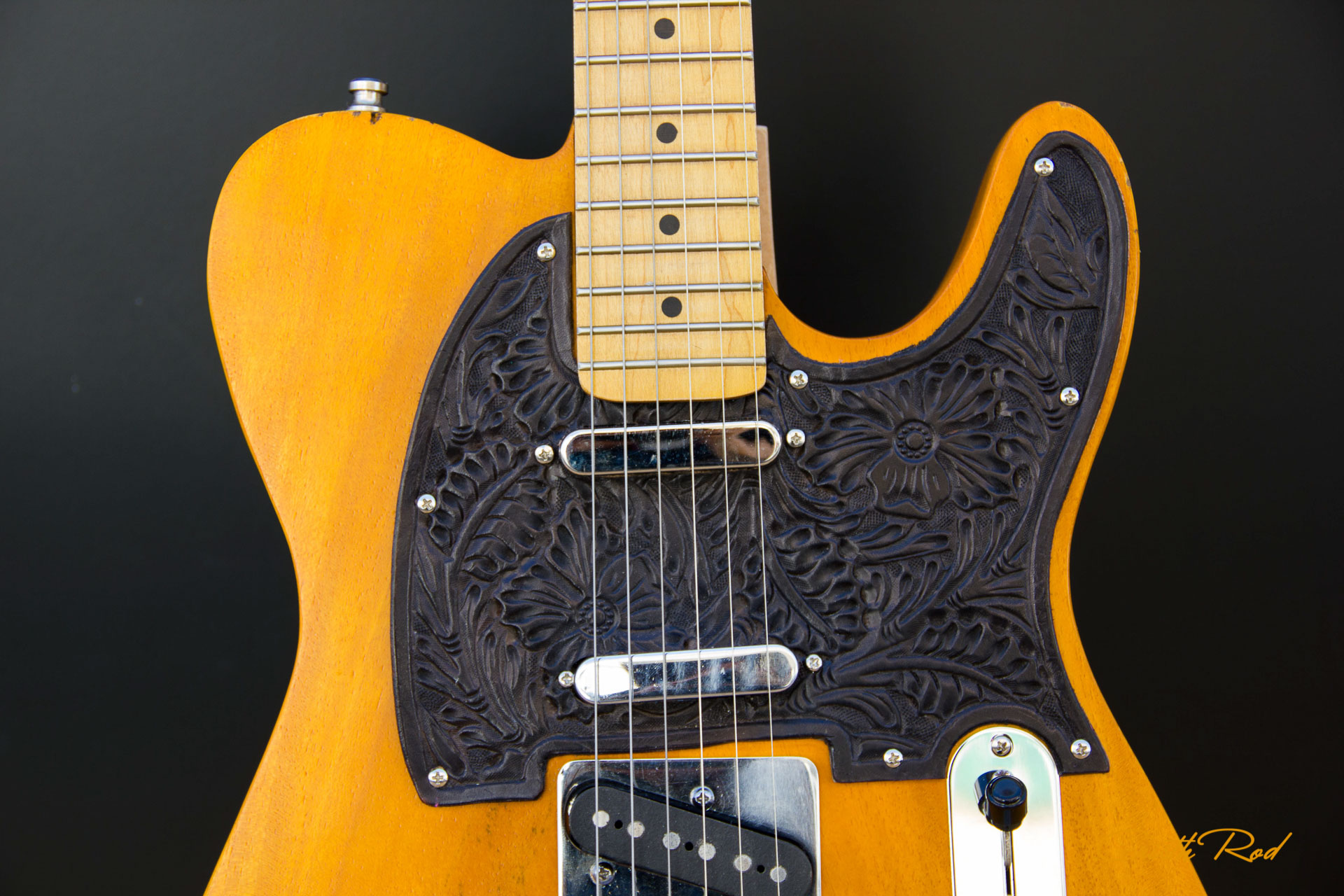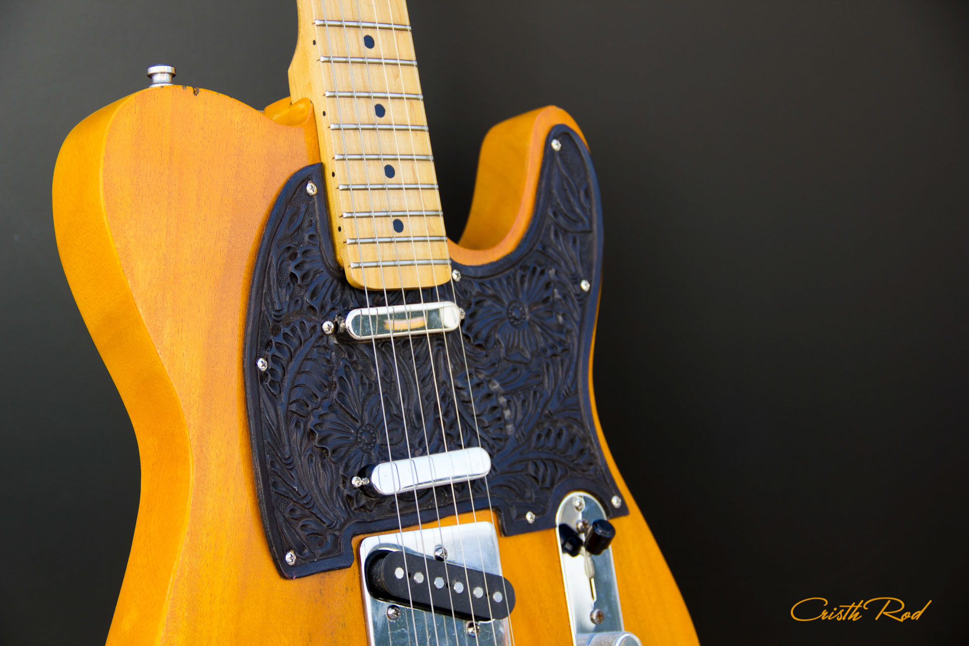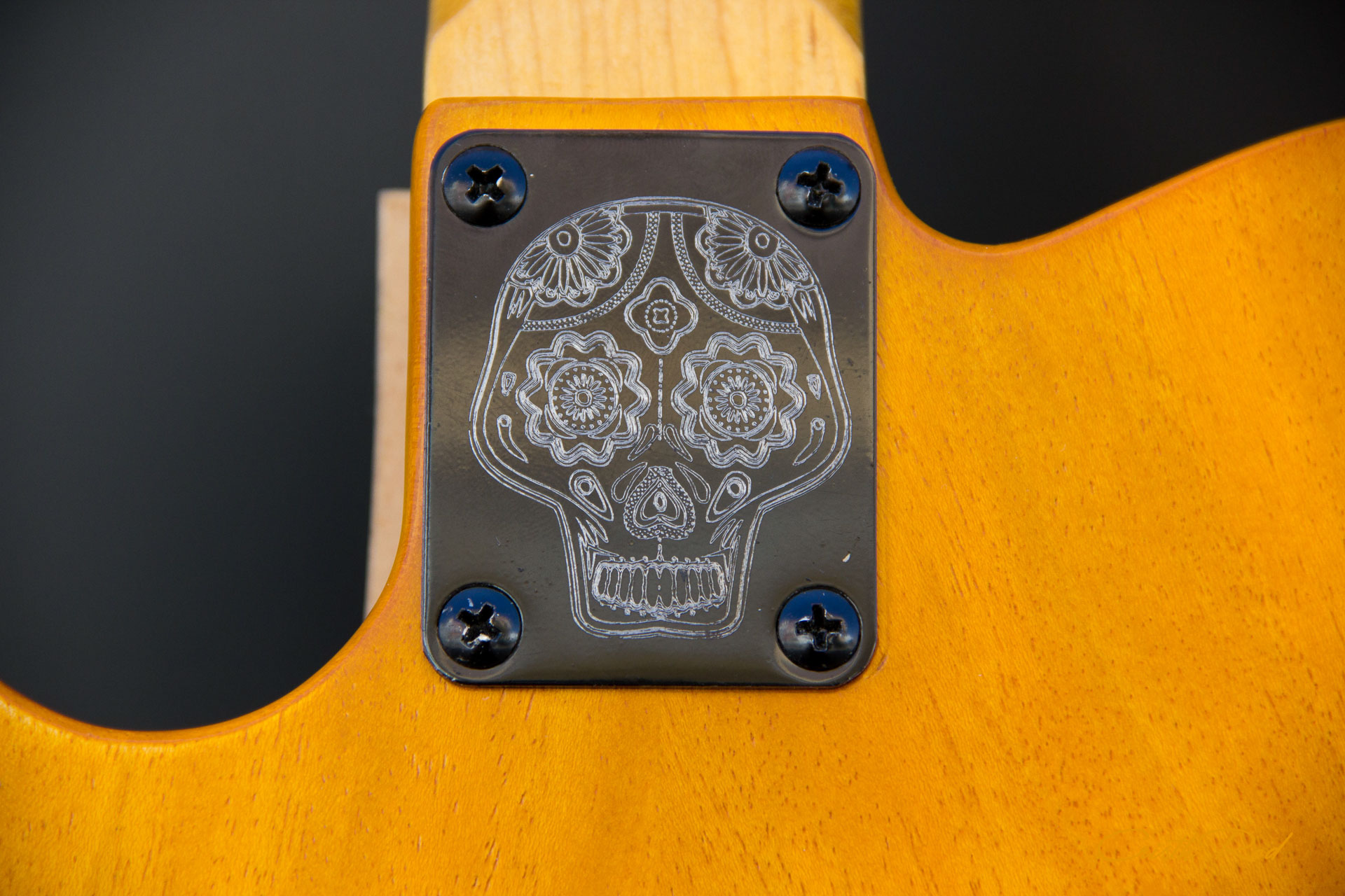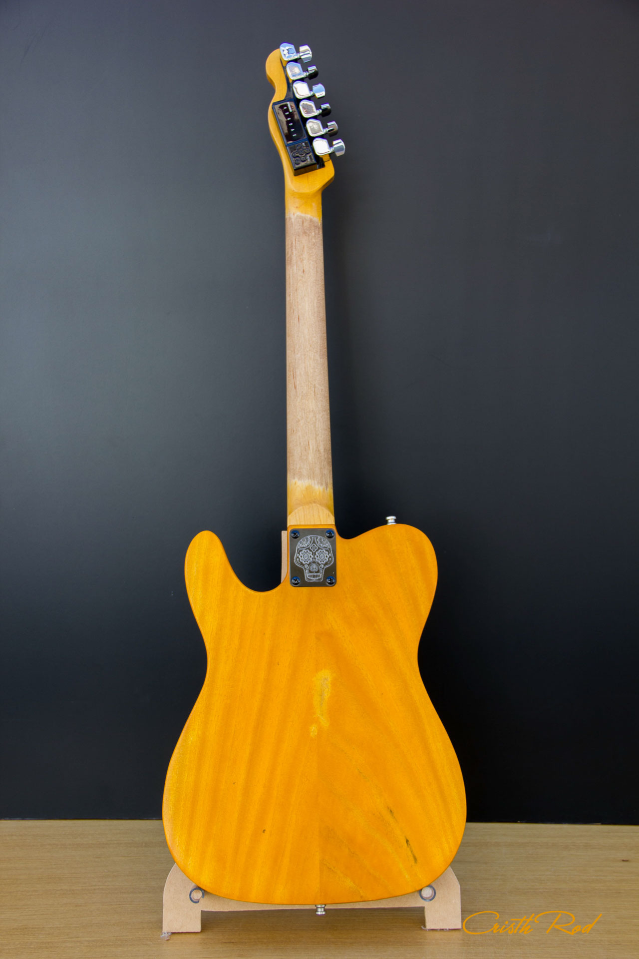 Estuche rígido | Golpeador en cuero grabado | Placa de mástil con Calavera grabada | Acabado Vintage Relic